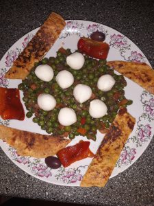 ПОДРОБНА ИНФОРМАЦИЯ – Цялата порция е за 3бвпм .Въглехидратите от грахта и нахутеното брашно,протеините от моцарелата и сиренето,мазнини от зехтина и маслините.Подходящо за обяд или вечеря.